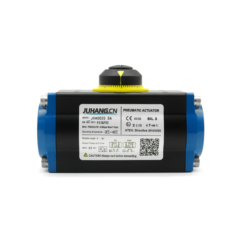 Rack и Pinion pneumatic активирачот со двојно дејство JHA0020DA се напојува со компресиран воздух, управувано од директно движење на клипот решетката за да се вози менувачот на менувачот на излезната вратило и излез од аголниот мозочен удар на пневматскиот активирач. Широко користена во вентилот за топки, вентилот за пеперутки, вентилот за приклучок и прекинувачот и прилагодувањето на вентилот со мозочен удар со агол, исто така, може да се примени во други ротирачки прилики, е идеален уред за постигнување на контрола на автоматизација на индустрискиот гасовод.